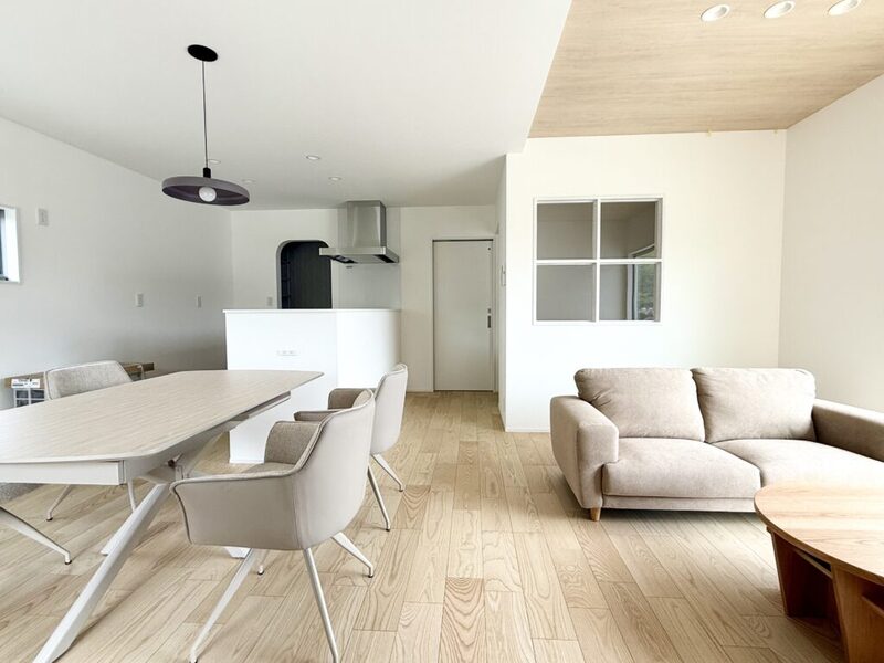 リビングには大きな窓を設け、日当たり良好です。また、オープンキッチンなので、リビングやダイニング、ヌック、スタディスペースもキッチンからしっかり見ることができます。